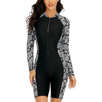Womens Rash Guard Long Sleeve One Piece Swimsuits Zipper Front with Boy Shorts Swim Shirt Uv Protection UPF 50
