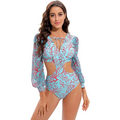 Women's Puff Long Sleeves One Piece Swimsuit Rash Guard V-Neck Bathing Suit 2023