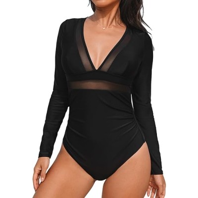Women's One Piece Swimsuit Long Sleeve V Neck Mesh Panel Ruched Bathing Suit