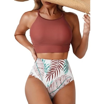 Women's Bikini Sets High Neck Tropical Leaf Print High Waisted Two Pieces Swimsuits Bathing Suits
