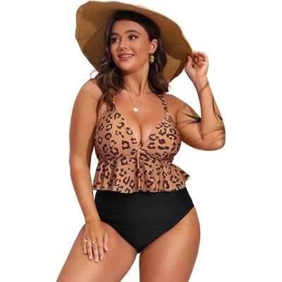 Women Swimsuit Plus Size Bikini Set Two Piece Bathing Suit V Neck High Waisted Flowy Ruffle Hem Floral