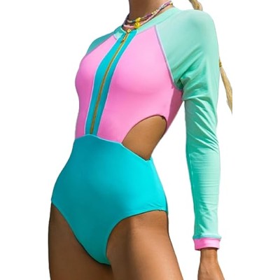 Women One Piece Bathing Suit Tummy Control Swimsuits High Neck Zip Front Monokini Color Block Rash Guard Swimwear